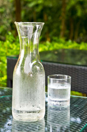 Clear Cold water flash and glass with greenery background.