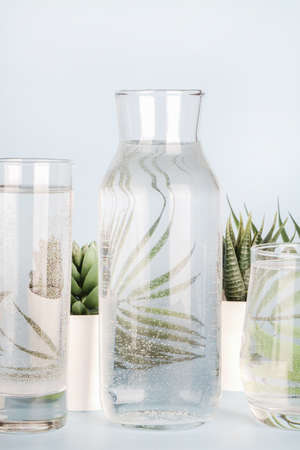 Modern water decanter with eucalyptus branches in minimalism style