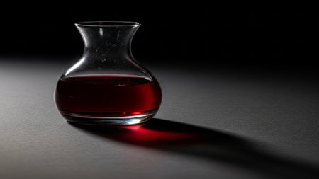 A glass decanter with red liquid on a black background.