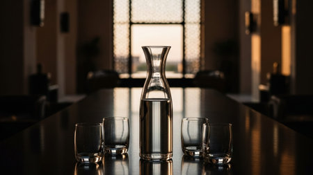 An elegant glass carafe filled with water stands on a wooden table, next to a filled glass. Sunlight streams through a window, creating bright reflections.