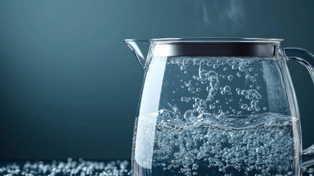 A captivating image of a clear glass pitcher filled with boiling water, showcasing rising bubbles and steam in a serene kitchen setting.