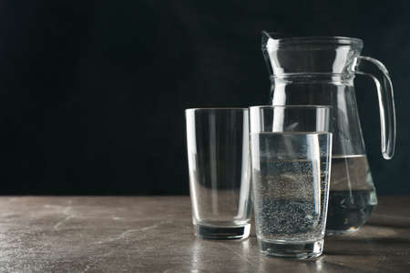 Jug with water and glasses on gray table, space for text