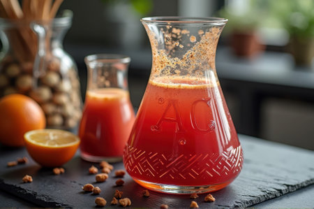 Freshly squeezed orange and acerola juice in elegant glass pitchers. That the image is generated using AI.