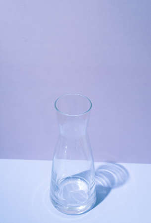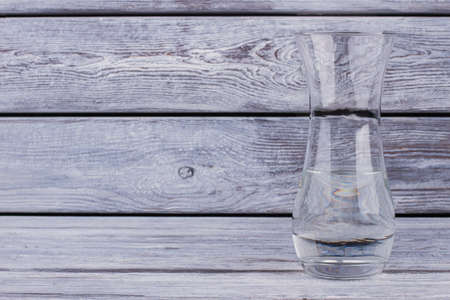 Glase vase with water on wooden background. Decorative clear glass vase and copy space. Beauty and fragility.