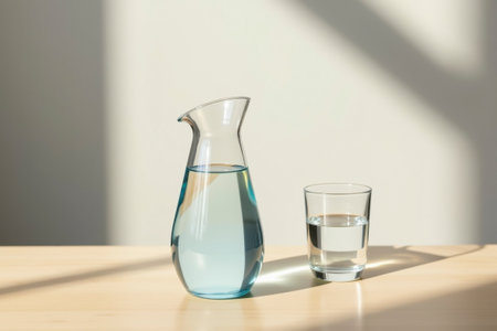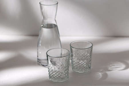 Elegant glass jug of clear water alongside two glasses on a bright table, with natural light enhancing freshness.