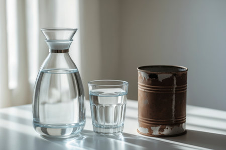 A glass carafe and a glass of clear water stood next to an old, rusty tin can. The contrast symbolizes purity and decay, life and deterioration, hope and threat.