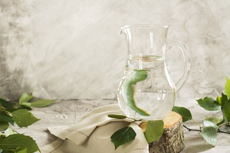 Birch sap in a glass jar over stone table. Natural light. Selective focus