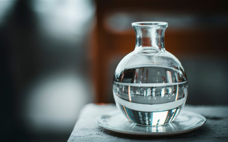 A minimalist glass vase filled with water, beautifully reflecting its shape on a smooth surface. This serene composition offers a touch of elegance for any design context.