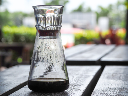 A beautifully crafted glass vessel filled with a dark liquid showcases condensation on its surface against a textured background, ideal for culinary or beverage themes.