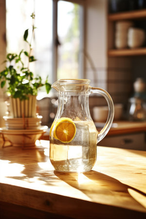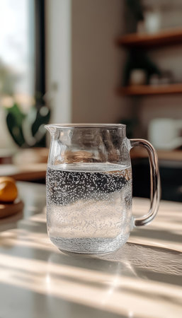 Clear Glass Pitcher Filled with Water on a Sun-Drenched Kitchen Counter with Room for Text