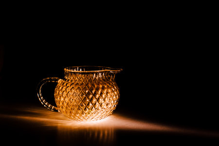 color photo of a glass vessel for a tea ceremony, close-up of the glass texture illuminated with a bright orange light on a dark background