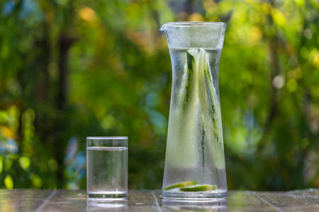Water in glass with cucumber and lemon on wooden table in tropical cafe, Thailand, close up