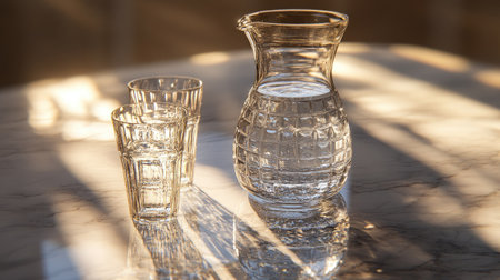 Crystal-clear water in a glass jug with glasses on a marble table, reflecting light to create a fresh, pure, and calming visual.