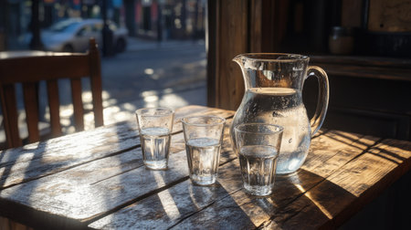 A jug and two glasses of clear water on a wooden table with sunlight streaming in, highlighting the purity and refreshing nature of water.