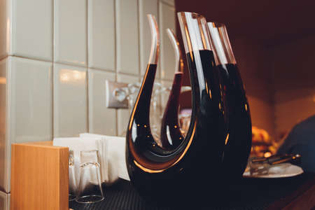 Amber wine. A splash of wine in decanter. Traditional wine according to the ancient Georgian technology. Concept. Copy space. Close up and vertical orientation.