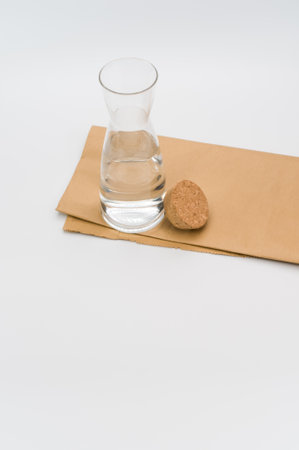 glass flask filled with pure clean water on a white and food paper background with text space