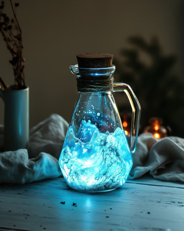 a glass jar with a blue light inside