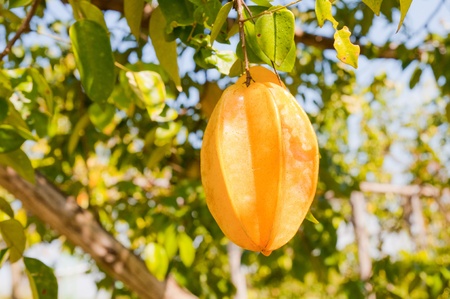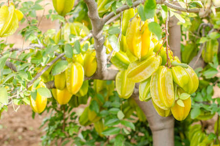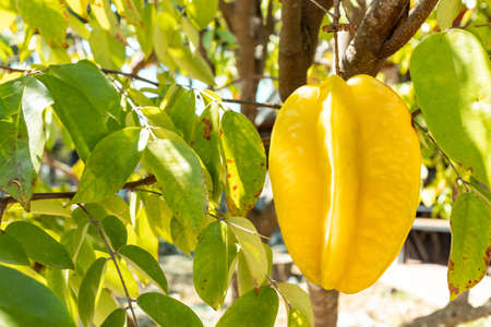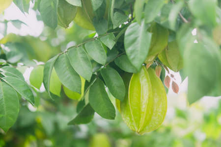 Tropical star fruit tree with ripe fruit hanging from tree branch. Star fruit is popular in asia, sour and sweet taste fruits