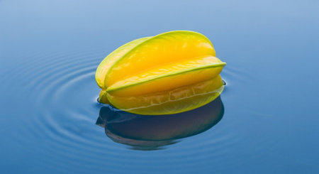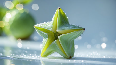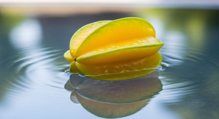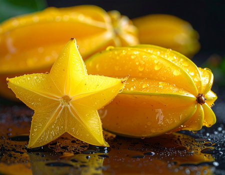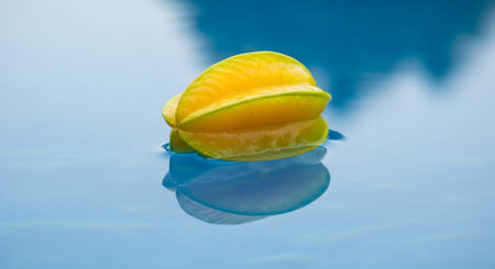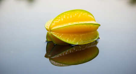 A ripe star fruit sits on a reflective surface with one half sliced open. Its bright yellow color and star shape highlight its juicy texture and freshness.