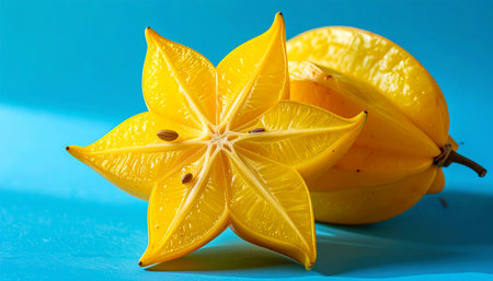 A whole yellow star fruit rests behind a sliced star fruit on a bright blue background, with subtle shadows indicating studio lighting.