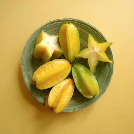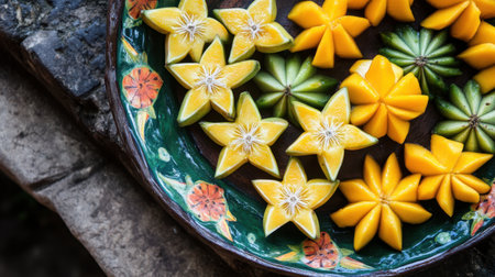 A stunning display of vibrant star-shaped fruits in bright yellow and green hues arranged artfully on a decorative plate, showcasing nature's beauty.
