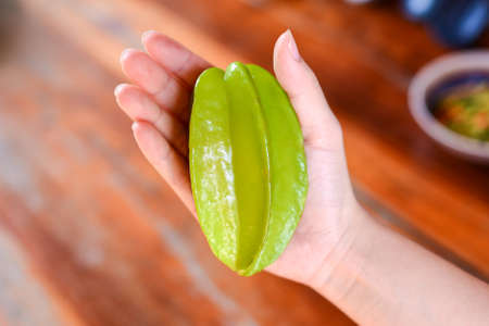 Star fruits on hand, Tropical fruit, wooden table.