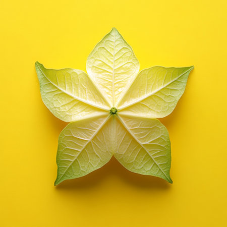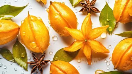 A visually appealing composition featuring sliced starfruit and vibrant leaves arranged artistically on a light background, highlighting tropical freshness.