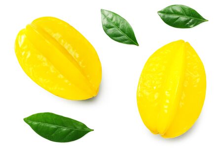 Yellow Carambola with green leaves isolated on white background. top view