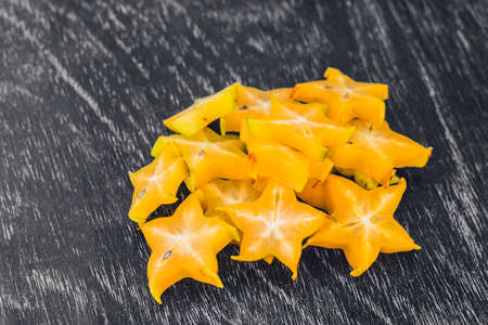 Star fruits on wooden table. Thai fruit : Star fruit is popular in asia, sweet taste fruits. Star fruits sliced on wood background. Selective focus.
