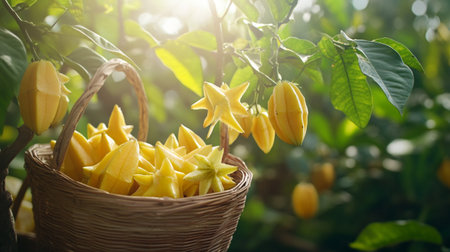 Star fruit or Ylang-Ylang in basket on green nature background