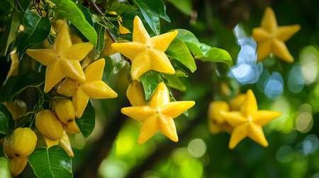 Ripe orange averrhoa carambola or star fruits growing on tree in tropical climate, ready for harvest close up