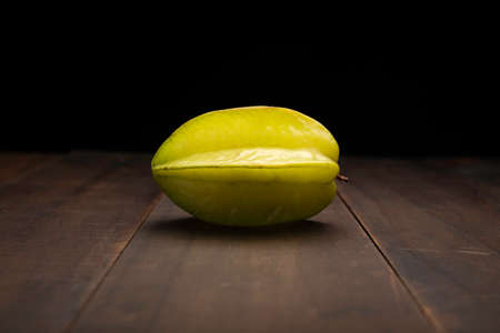still life image of one starfruit or carambola. Close up on rustic wooden surface and black background