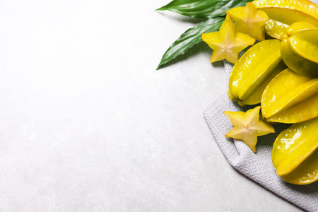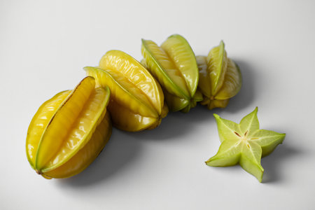 Close up of a delicious looking star fruit cut in slices on a light background. Healthy and vegan food concept.