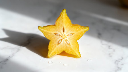 Fresh juicy yellow carambola fruit cross-section displaying five-point star shape and seeds, placed on white marble countertop with scattered water droplets and geometric daylight shadows.