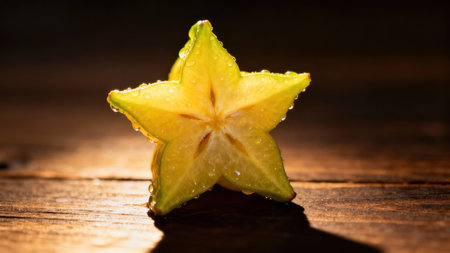 Vivid yellow and green carambola cross section sparkling with moisture, featured in dramatic low key lighting against a deeply shadowed brown wooden background.