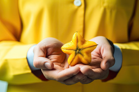 knowledgeable doctor holds a vibrant yellow star fruit, showcasing its unique shape and promoting its rich vitamin content for optimal health against a sunny yellow background