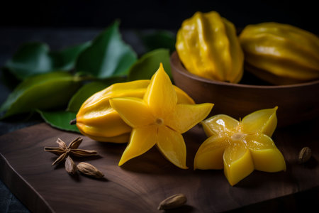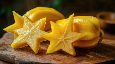An AI generated illustration of fresh carambola on a wooden board