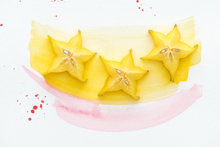 top view of three ripe star fruits on white surface with yellow and pink watercolors