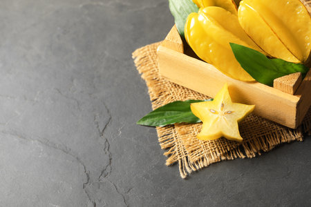 Delicious carambola fruits on black table, above view. Space for text