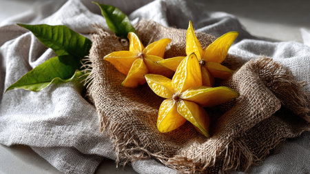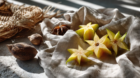 Explore the beauty of freshly sliced star fruits displayed on a soft linen fabric, surrounded by natural textures and warm light, ideal for food photography.