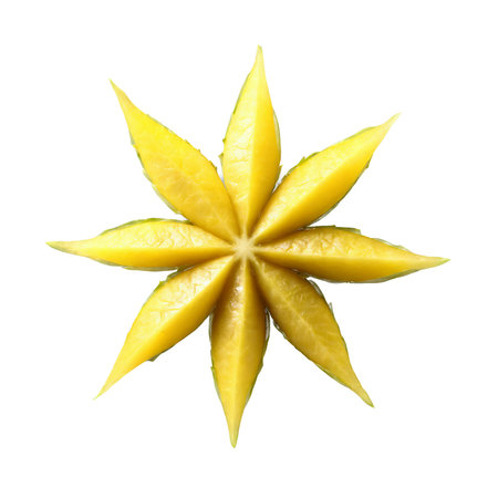 A bright yellow star fruit slice is presented against a clean white background.
