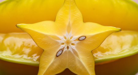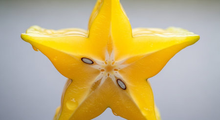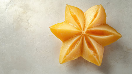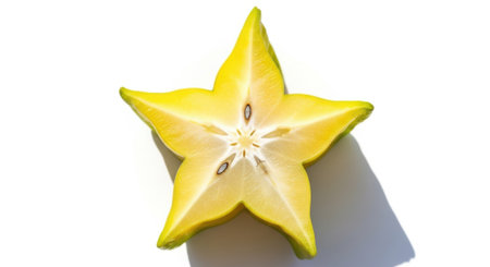 A vibrant slice of star fruit displayed against a light backdrop, showcasing its unique shape and fresh texture, perfect for culinary inspiration.