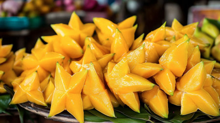 Thai starfruits arranged on a table, their golden yellow color and unique star-shaped slices tempting to eat.