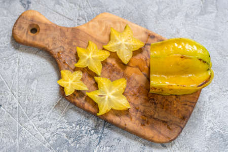 Exotic starfruit or averrhoa carambola on wooden cut board. Healthy food, fresh organic star apple fruit.