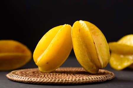 Star fruit or carambola on black background, selective focus.