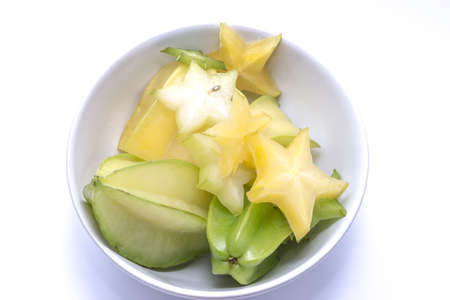Close up of a delicious looking star fruit cut in slices on a light background. Healthy and vegan food concept.