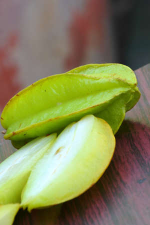 Star fruits on wooden table. Thai fruit : Star fruit is popular in asia, sweet taste fruits. Star fruits sliced on wood background. Selective focus.