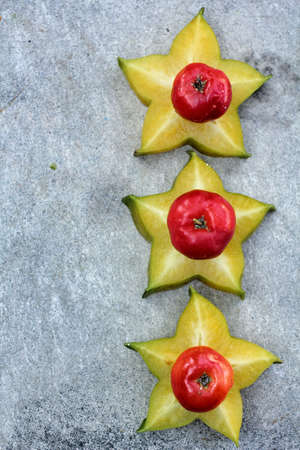 Exotic starfruit or averrhoa carambola on wooden cut board. Healthy food, fresh organic star apple fruit.