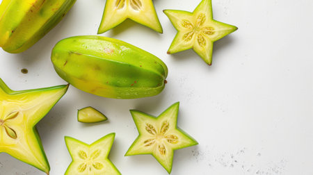 starfruit, a vibrant and exotic tropical fruit, is beautifully arranged on a white chalkboard, creating a stunning flat lay view banner perfect for healthy eating, fruit lovers, and food bloggers, evoking feelings of freshness, nutrition, and summer vibes. ai generated