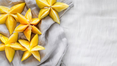 Capture the essence of tropical freshness with vibrant starfruit arranged on soft linen fabric, perfect for culinary and lifestyle themes.